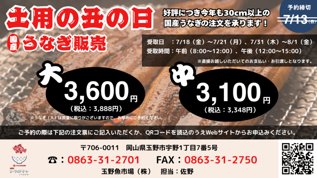 今年も玉野魚市場ではうなぎ注文を行うこととなりましたので、ご案内いたします。